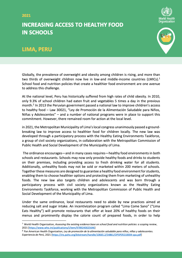 In June 2021, the Municipality of Lima adopted a major policy milestone in its efforts to reduce obesity and noncommunicable diseases: a city ordinance to create healthy food promotion programs, restrict the availability and marketing of unhealthy foods around schools and mandate measures such as the removal of saltshakers in restaurants.